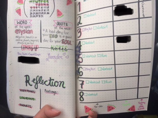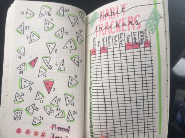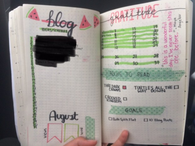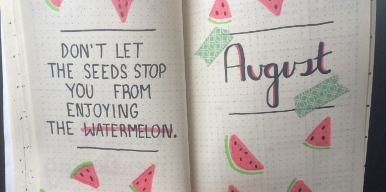 My theme for this month is watermelon, because in my opinion, there’s nothing that says summer like a big, juicy watermelon. Well, reading your book on the beach while eating a banana creamsicle also screams summer pretty loud, but I wasn’t sure how to make that into a bullet journal theme, so I just went with watermelon. On my title page I drew some slices of watermelon, as well as a watermelony quote, and, of course, I wrote August on the opposing page. Some green washi tape accents it all. I like this set-up better than my previous one page set-up because I have more room for drawing, quotes, and literally anything else that I want to include, which is great. This is the before and after: