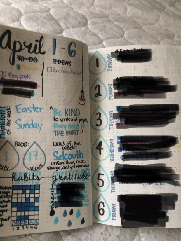 And finally we get to my weekly spread!! With the removal of my gratitude log, goals, mood and habit trackers, I had more space to play around with. So I added a mini calendar, and a space for a weekly reflection, while keeping room for a word and quote of the week from my past spreads. On the other page, I split my daily planner thingy into three sections: To-do, Events, and Today in One Word, which should be fun.