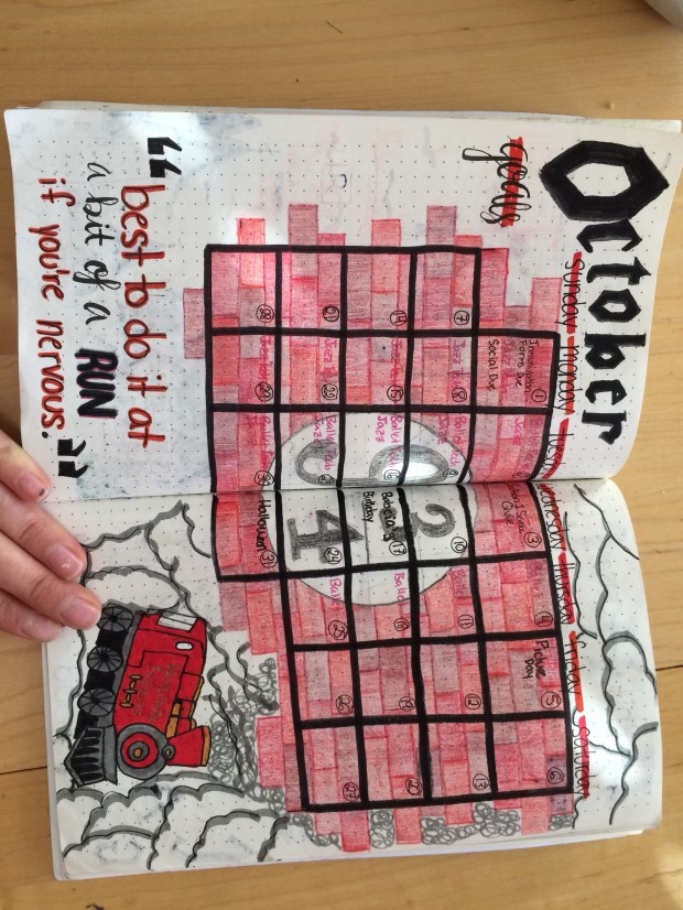 Now on to my October calendar. I did this one Platform 9 3/4 style! There’s a simple brick background, Harry Potter style lettering, a drawing of the Hogwarts Express, and another JK Rowling quote: “Best to do it at a bit of a run if you’re nervous.” which I love because it totally applies to just life in general.