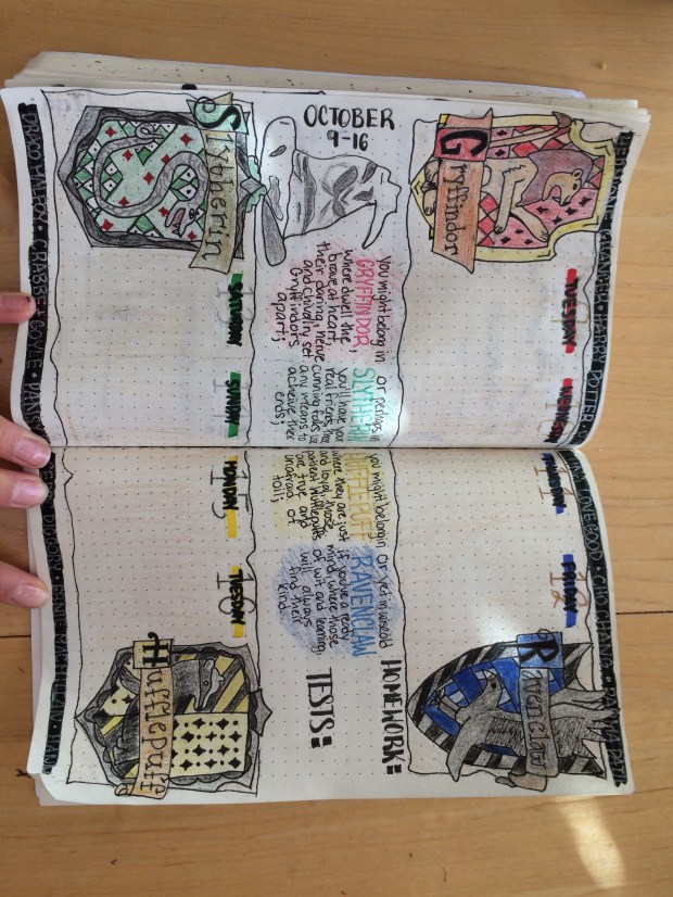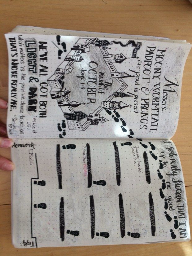 I stuck to the layout that I’ve been doing for the past few months for my title page- doodles and the name of the month on one side, and a quote on the other. This month I drew Hogwarts- which actually wasn’t as hard as it looks! Pinterest has a lot of Harry Potter themed doodles that you can reference (my fancy word for copy). For my quote I wrote one that I love from Albus Dumbledore aka JK Rowling; “Happiness can be found even in the darkest of times, if only one remembers to turn on the light.”. All in all, I think that these pages turned out great!