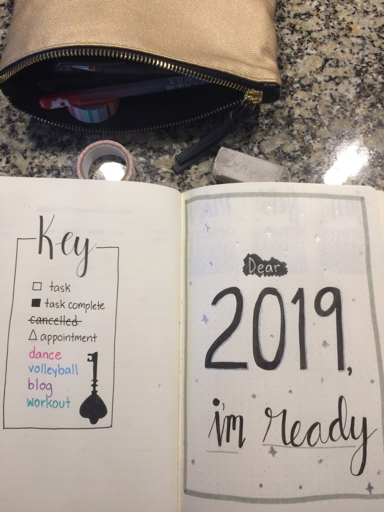 Last year I didn’t really use my index very much, so even though this journal already contains one, I don’t think that I’ll be using it. This means that the first couple of pages in my journal are my key and title page. I definitely simplified my key, because I didn’t use many of the bullets and colours that were in my key last year. also, I’m trying to keep the first pages of my journal pretty neutral, since each month I have a different theme and colour. So for my title page I wrote “Dear 2019, I’m ready” in black, silver and grey.