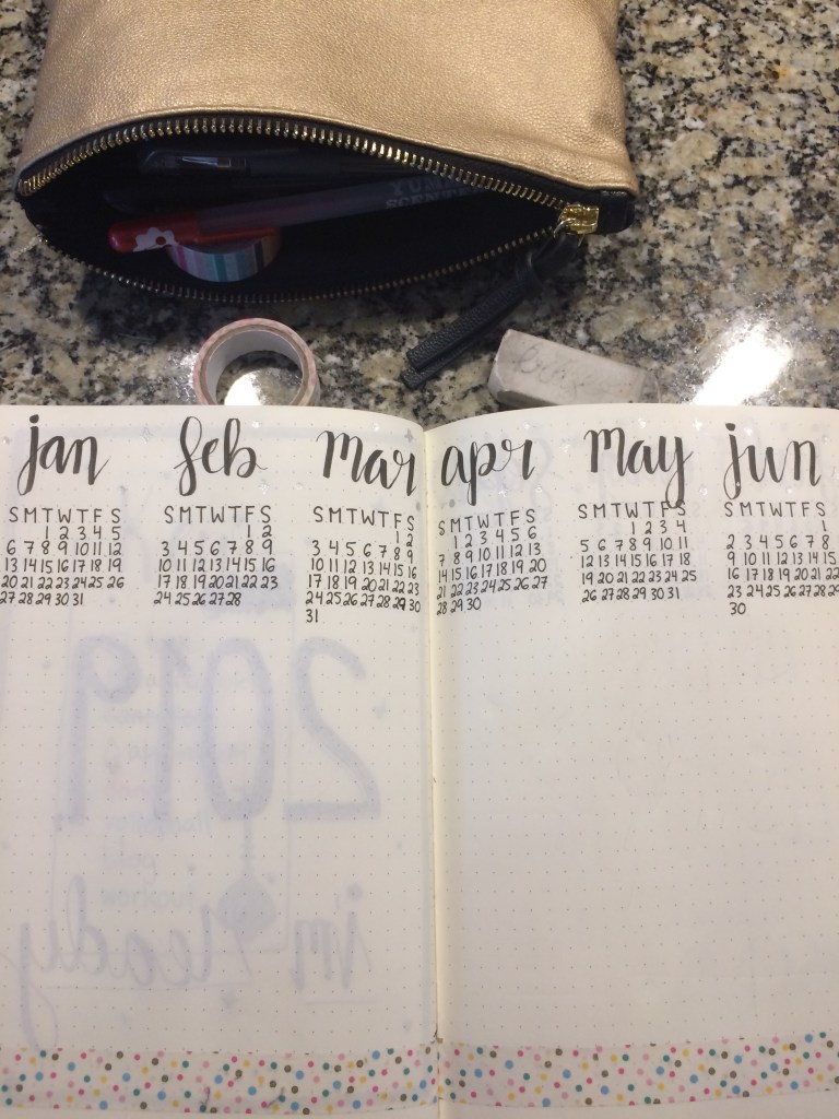 Onto my future log/year at a glance. As you can see, I have waaaayy more room than last year to plan out any future events! This is because I used four pages instead of two. The bottom was looking a little empty, so I decorated with some washi tape. I really want to get more crafty with my bullet journal this year, by using washi tape, paper, and even printing out pictures. I experimented with this in November and really liked the way that it turned out.