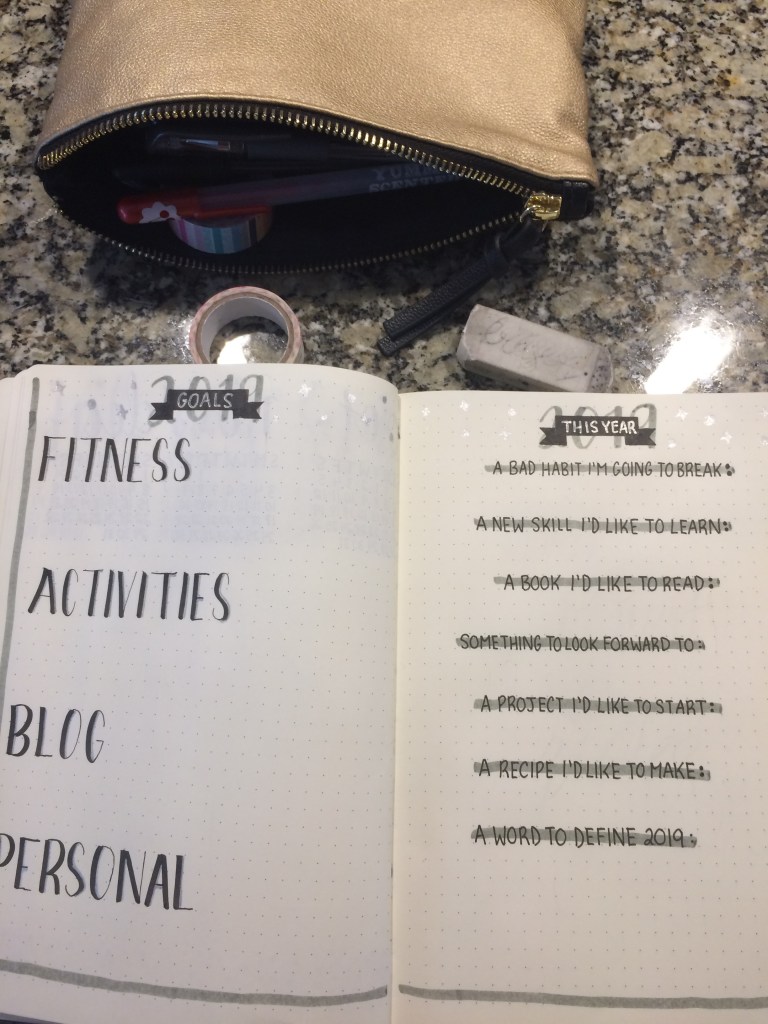Next, I drew out a space to write the goals that I have for 2019. The opposite page is titled “This Year”. I haven’t filled it in yet, but basically I’ll just write some resolutions that I have for the new year, as well as some things that I’d like to do this year. There’s also a spot to write down one word that I want to be my focus in 2019. I love doing pages like these, because they allow you to look back on what you want to accomplish and help you get focused.