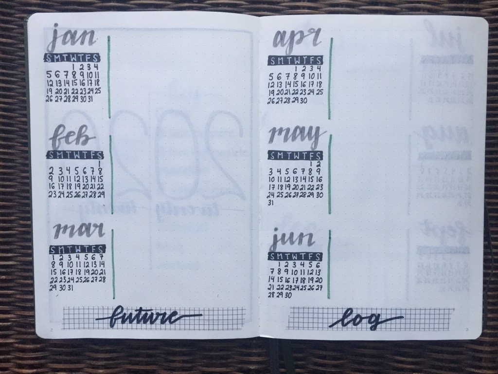 These two spreads are my future log. Here I’ll write down events so that I can plan my year before I complete each monthly spread. Once I have a full calendar set up for each month then I can transfer all of the events into that, and then from my monthly calendar into a weekly spread. I kept there spreads simple as well, using a grey marker to write out the months and only putting in hints of green.