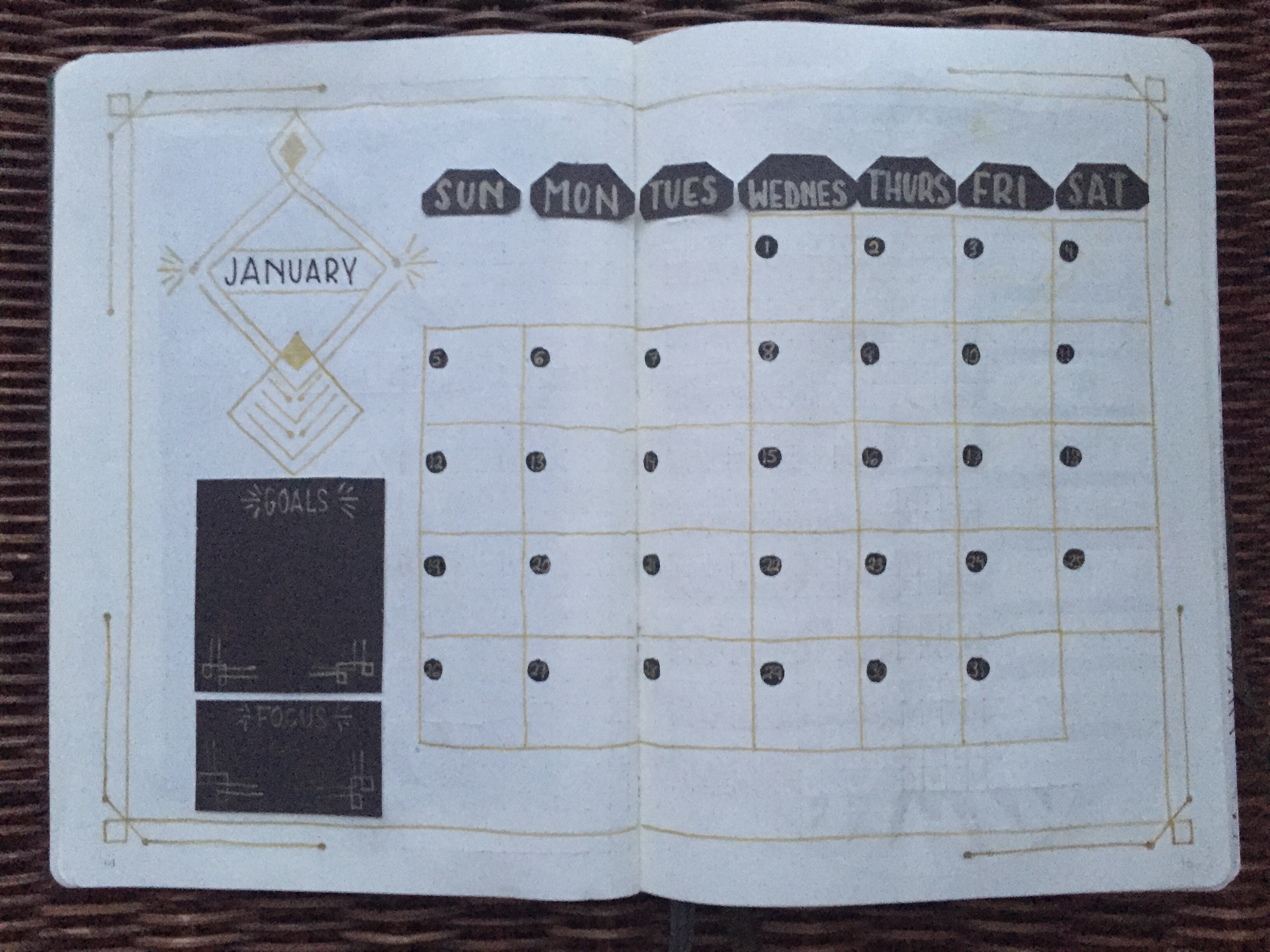 Next is my calendar spread. This is something that I kept the same as last year, because it worked really well for me. I used some more black paper for a goals and focus section. Here, I’ll write things that I want to accomplish this month and something that I want to focus on.