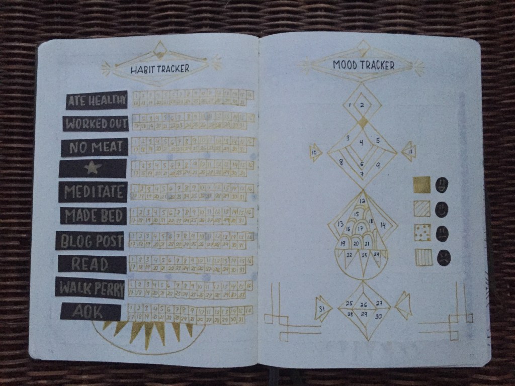 Here’s where I switched things up! Instead of having a grid habit tracker, I’m going to try out having individual habit trackers and crossing off the day when I complete each habit. It’s a lot more work to set up, but we’ll see if I prefer this style or not. For my mood tracker, I drew another Art Deco design and left it empty so that each day I can fill a space in with a different paterm to represent a certain mood.