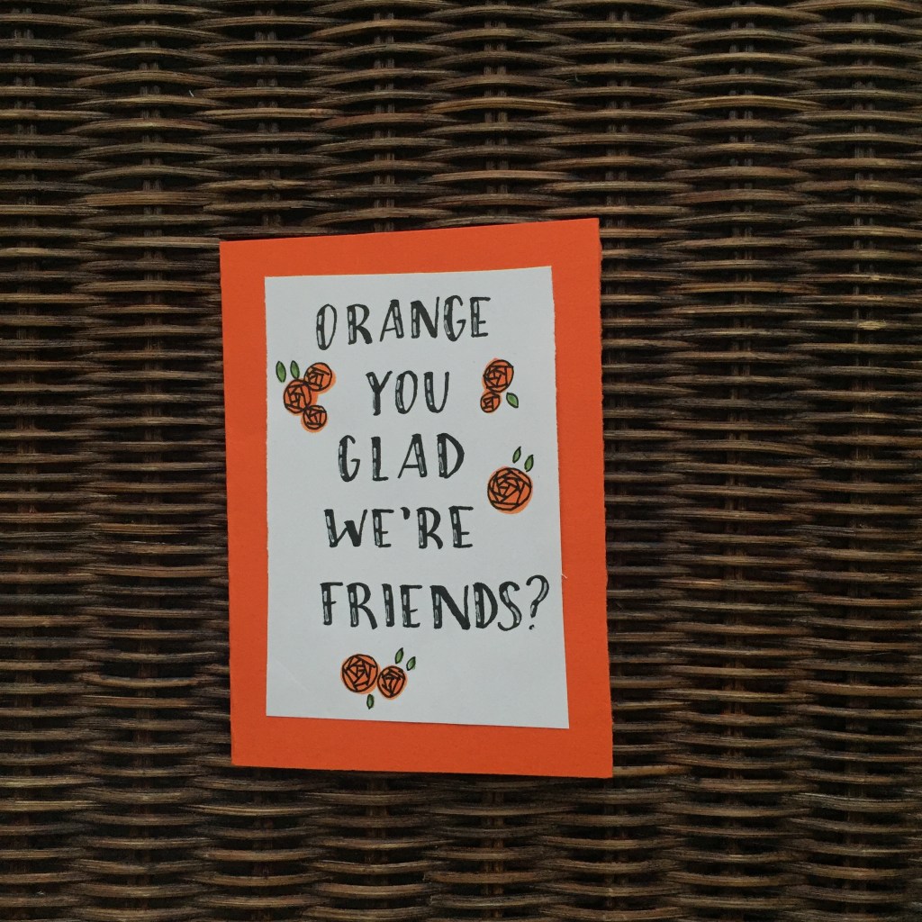 On the nest card, I wrote out “Orange You Glad You’re My Friend?” on some paper and glued it onto orange card stock. Valentine’s Day is the best for puns!!