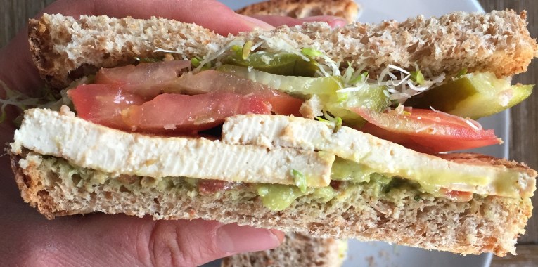- Mash the avocado in a bowl. Scoop half of it onto a piece of bread and spread it around. Place two of the tofu “steaks” on top, along with half of the sliced tomato, half of the sprouts and one sliced pickles. Place another piece of bread on top.