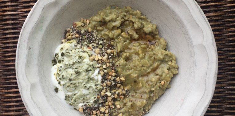 1. Mix together the oats, matcha, maple syrup, and water in a small pot. Bring to a boil over high heat, then turn the burner temperature down to low and let simmer until your desired thickness is reached, about 7 minutes.