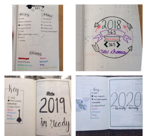 I always start with a key and a title page at the front of my journal. The key includes the different bullets and colours I’ll be using to record tasks and events throughout the year. I don’t usually reference it too much because I have it memorised, but it’s still good to have. As you can see, my first year journaling I made my key pretty complicated. I’m going to tell you right now that there’s no way you’re going to pull out a stencil or draw a little symbol every time you write something down. Especially in school! Keep your key simple with a few colours and bullet shapes, and you can always tweak it later on. As for the title page, I just have fun with it every year;)) Sometimes I throw in a quote, and other times I just keep it super simple. Anything goes!