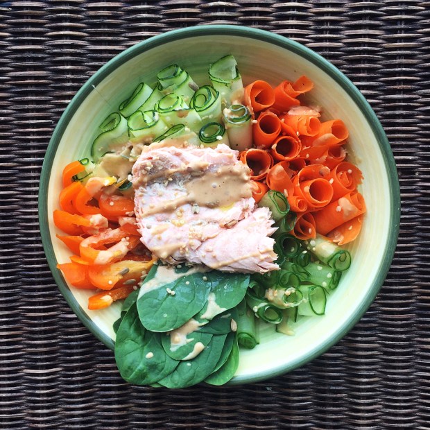 In this salad I used zucchini, which is one of my favourite summer vegetables, along with cucumber, carrots, and bell peppers. Top it all of with some spinach, crispy quinoa, sunflower seeds and a protein of your choice (salmon goes amazing in this salad), and you’ve got a perfect summer salad!