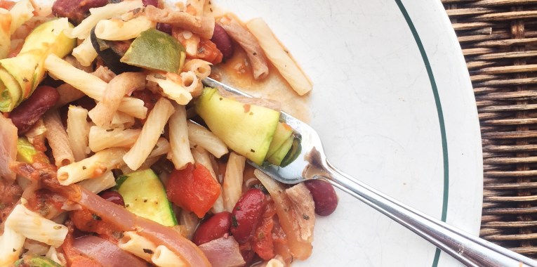 2. While the sauce is simmering, use the veggie peeler to create as many zucchini ribbons as you can. The centre part of the zucchini, where the seeds are, won’t make nice ribbons, so you can dice it up at toss it in the sauce, making sure it has at least 10 minutes to cook in there.