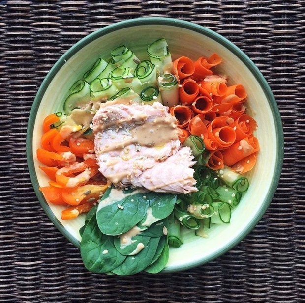 This salad is so fresh! It has spinach, peppers, any protein you’d like, and the secret weapon- delicious ribbons of zucchini, cucumber and carrot made with a veggie peeler! A peanut dressing tops it all off;))