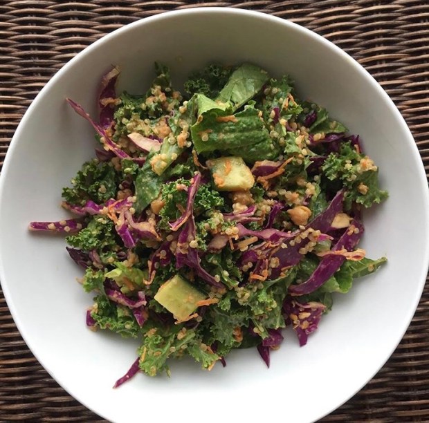 This salad has a TO DIE FOR peanut dressing, as well as purple cabbage, kale, carrots and cucumbers. It’s a great base for you to add protein to, and also a perfect side salad.