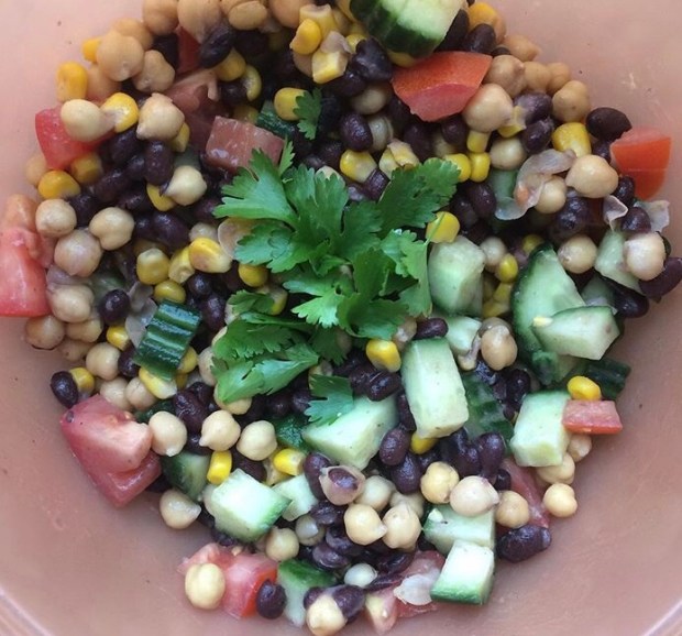 I looooove a good bean salad! In this one, you’ve got chickpeas, black beans, corn, tomatoes, cucumber and parsley, all tossed in a perfectly garlicky Dijon dressing. Great for summer barbecues and for my lunch!;))