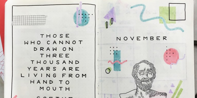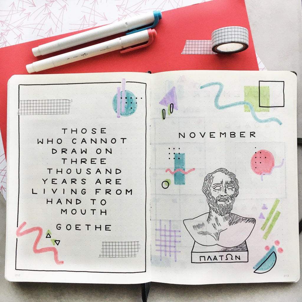 First is my title page! I have my bust of Plato surrounded by abstract doodles. The colours that I used this month are all Zebra Mildliners, and I used this reddish-pink colour, a blue, a light green, and a purple. They’re all kind of the same saturation and I think they work well together:) I have my quote page on the opposite side as usual, and I also used my grid washi tape again this month because I think it fits in with the theme and adds a little something. I’ve actually been using some Faber-Castell black fineliners since my Sakura ones ran out, and I love them! The ink is so black and the sizes are perfect.