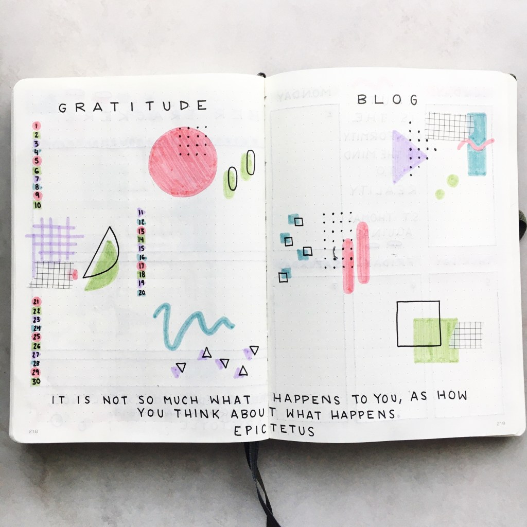 Loving my Gratitude Log and Blog planner this month! The shapes are so fun and everything looks very minimalist which is new for me- I like to fill the page lol. Anyways, I only wrote out the numbers once in this spread because I’ll just use the same line each day. I made sure to include a lot of quotes throughout this set-up to keep up the philosophy theme, so there’s another one at the bottom.