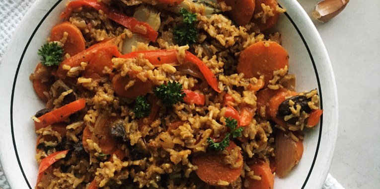 The vegetables get cooked down together in some coconut oil, then sauteed a bit more when the curry paste is added, and then everything simmers together in some coconut milk. To make this heartier and more of a one-pot meal, I thought, why not add in some rice? So brown rice gets thrown in too and cooked in all of the delicious flavours.