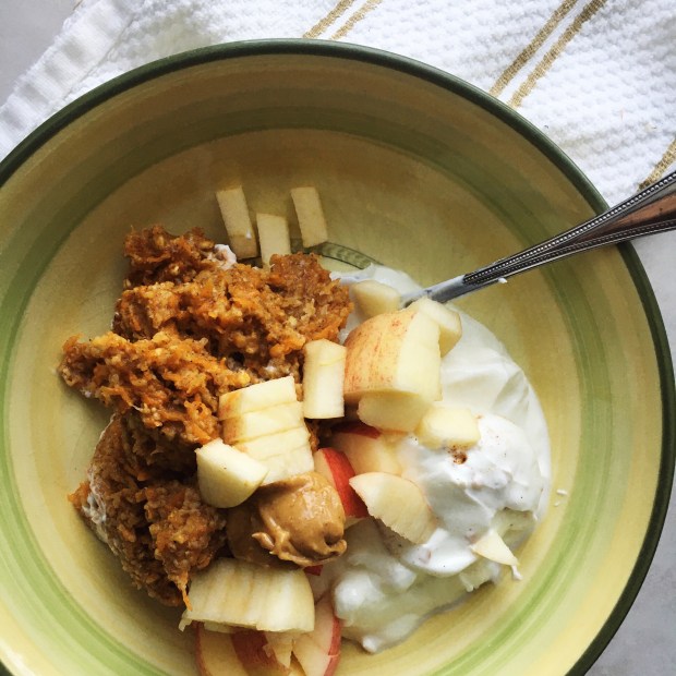 So yeah, two minutes in the microwave and you’ve got a BEAUTIFUL little cake that is perfect as a quick breakfast, a healthy dessert, or a snack anytime you’re craving some carrot cake! I love how the carrot shines through because it’s not too sweet. If you like your carrot cake a bit sweeter though, you can add about a tablespoon of maple syrup. Plus- get creative with some add-ins too! I went very classic with mine, but chopped nuts, raisins, or even pineapple would be very tasty in here. Those things would all be great as toppings too! After I took nice pictures of this I scooped it into a bigger bowl and ate it with lots more yogurt, the rest of the apple, and some peanut butter.