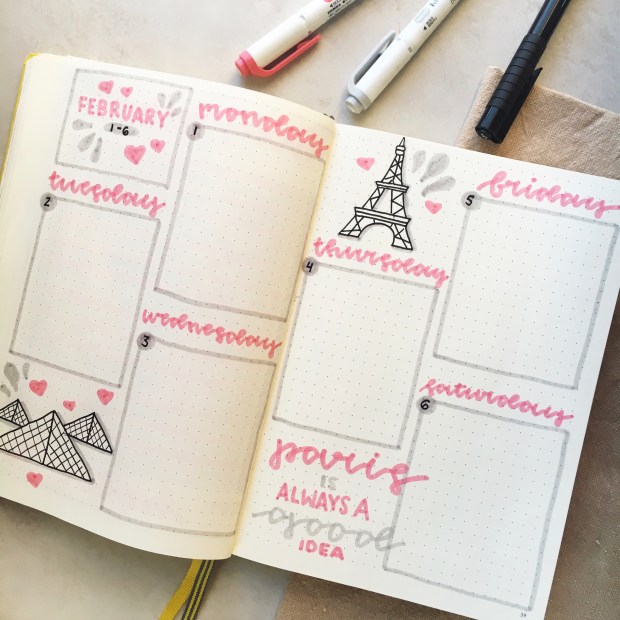 First weekly of the month! I think it came together really nicely. I outlined that curvy edge of the page in my three main colours this month, and drew in those cherries and those sparkles around the days of the week. We’ve got space to write down any events and to-dos, and also to plan my workouts. Love it!