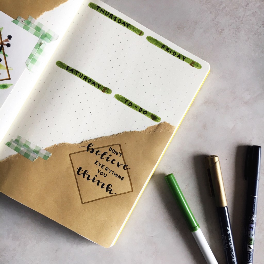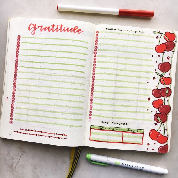 This page is so gorgeous too! It’s got my gratitude log, and then on the opposite page is a spot for me to journal a bit in the mornings. Especially since it’s so bright and nice outside in the mornings now, I’d like to start doing a bit of meditation and journaling each morning next month. Definitely a goal that I’m going to try and stick to! Underneath I made myself a little gas tracker just to keep track of how much I’m spending and when;) I cut the edge of the page around the cherries and outlined it in green, which looks cool too.