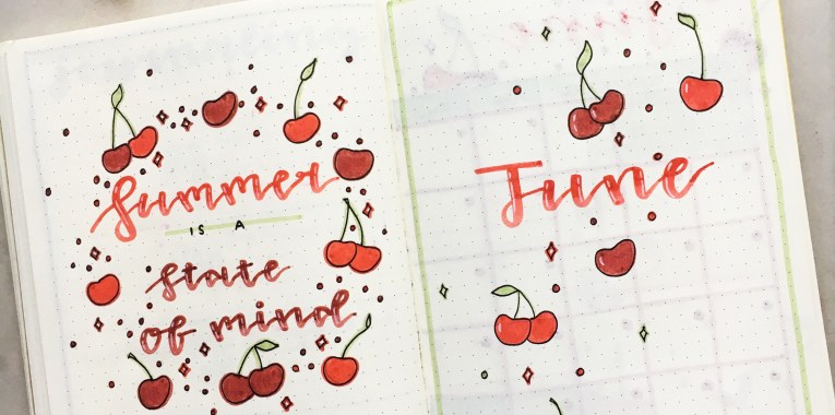 I’m excited to come back to my journal though and I love my June spread! I tried to keep the doodles simple so I can just quickly make weekly spreads and I don’t feel like I’m spending 3772839302 hours bullet journaling each week. Since it’s almost summer time I went with a cherry theme! I absolutely love cherries- they’re one of my favourite fruits, and the bright red and green is such a fun colour palette for some fun summer spreads!