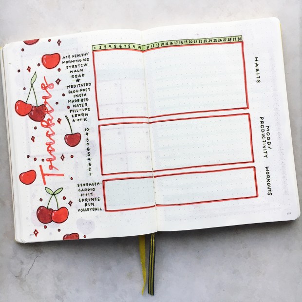 Kept my trackers and everything the same because I love how easy they are to fill out, and also how the charts and graphs look:) Although I did add another tracker to track my workouts! I drew some more cherries on the side too, and it looks so good.