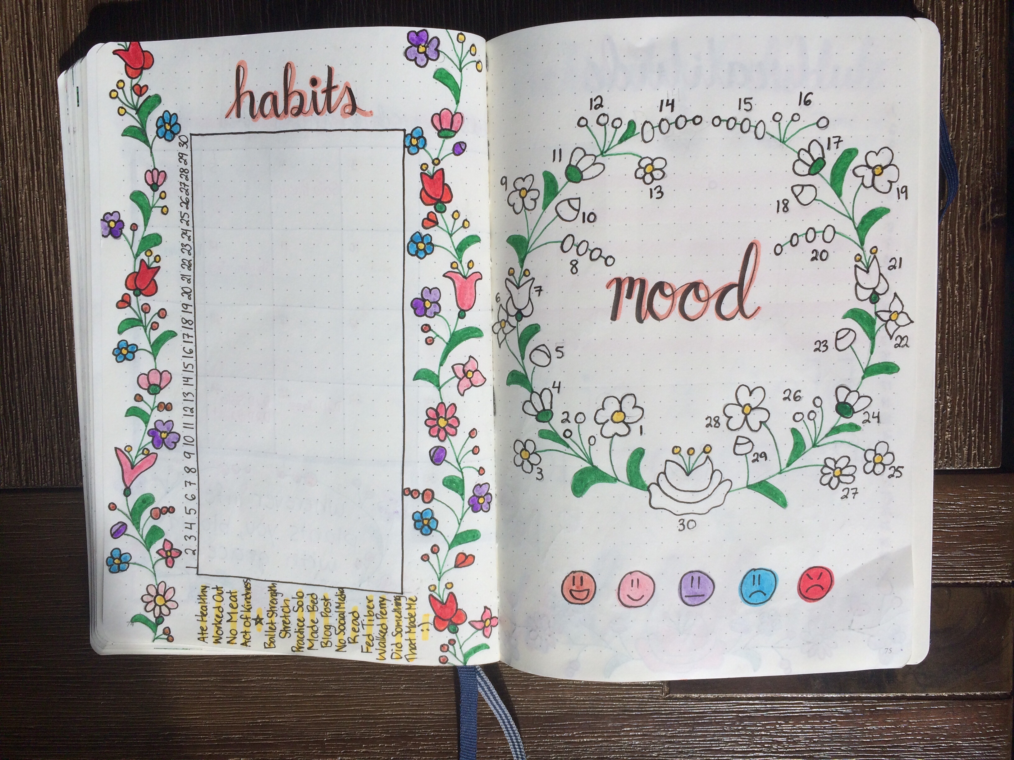 I drew my habit tracker to look like a polaroid, which I thought was cute. For my mood tracker, there’s a circle divided into 31 parts so I can colour one each day, with a compass in the middle.
