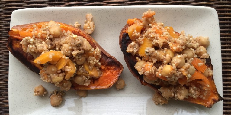 4. Once the sweet potatoes are soft, scoop out some of the flesh from the middle of each half and mash it into the chickpea salad. Place the potatoes on a plate and scoop an equal amount of chickpea salad into each, saving the rest for later.