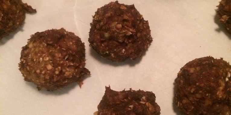 - Roll the mixture into balls by the tablespoon full and put them on a pan lined with parchment paper.