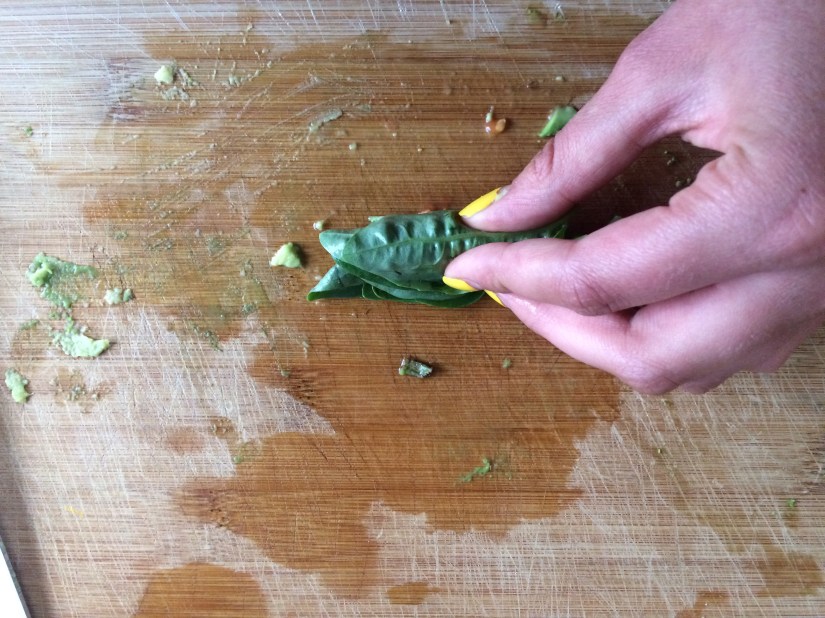 Proceed to cut the rolled basil the opposite way that you rolled it. Does that make sense? When you unravel the leaves they should be cut into long strips that look like this: