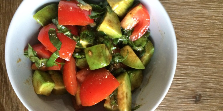 Hello:) I think that basil is my favourite herb out of the ones that I’ve posted about- the smell of it when you pick it off the plant is just amazing! This salad really showcases fresh basil, along with plump Roma tomatoes and perfectly ripe avocados. The simple balsamic dressing ties everything together. For this recipe, you’ll need to Chiffonade your basil, which basically means to cut it into thin strips. I’ll show you how to do this before giving you the recipe to this tasty salad. Enjoy!