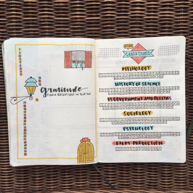 Here’s my title page! I drew 12 tiles that are 8×8 dots each, leaving some space at the top and bottom. It was lots of fun drawing out all these different designs! After I had coloured everything in, I went over the darker blue parts with my white gel pen for some extra detail. Then I wrote August in gold in a simple lowercase font. My quote for this month is “Go bravely, go deeply, or do not go”. While I don’t officially have a focus for this month, I want to make it a priority to give 110% in everything.
