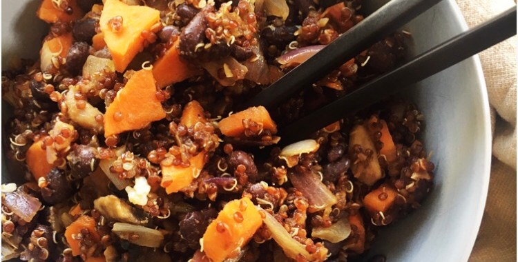 5. Heat up the remaining olive oil in a pan over medium heat. Add in the onion, garlic, cauliflower, mushrooms, chickpeas, and the insides of the zucchini. Sautee for about 5 minutes, until the onion is translucent. Add the balsamic into the pan and continue to cook for 2 more minutes. Remove the pan from the heat and set aside.