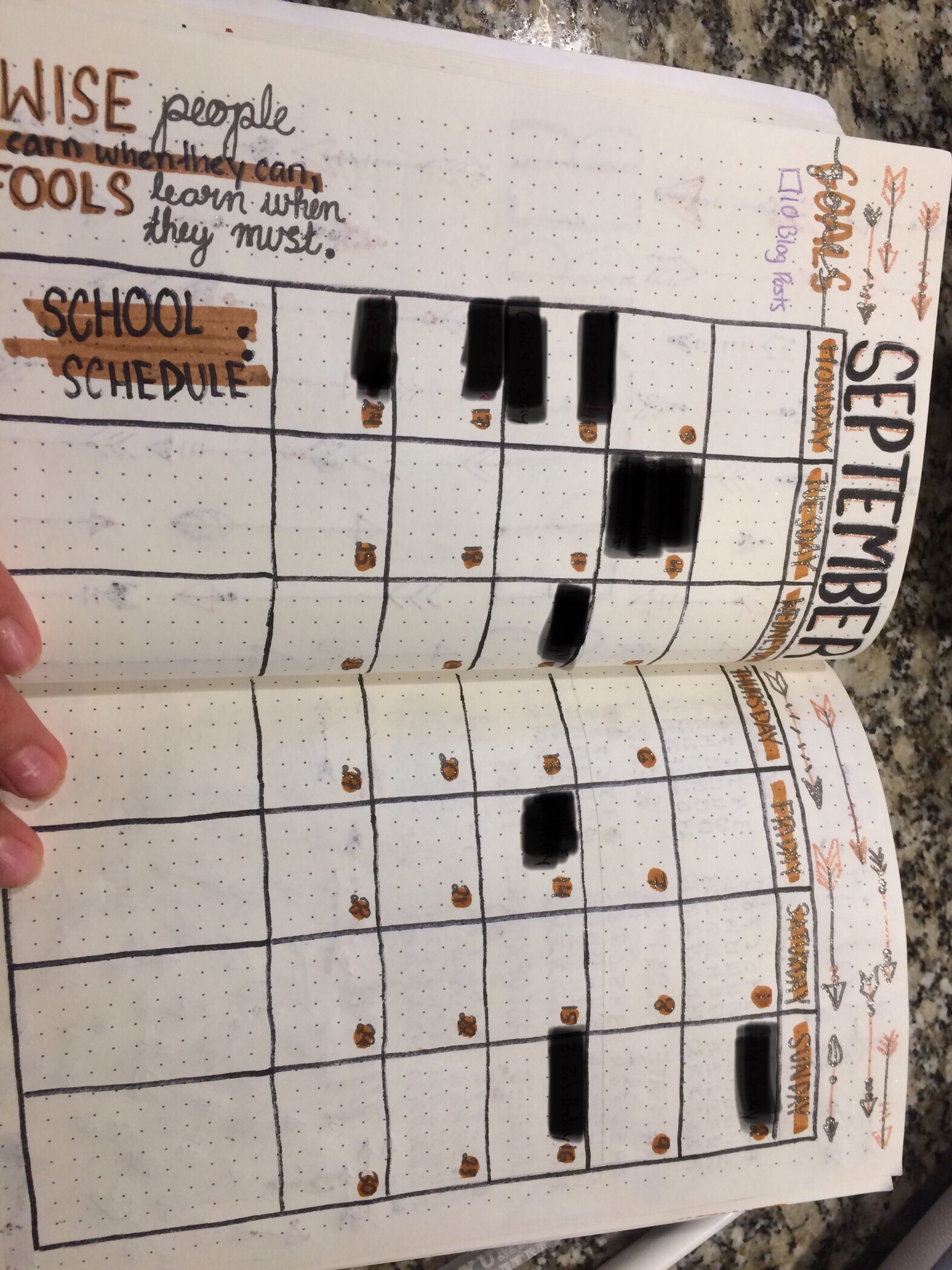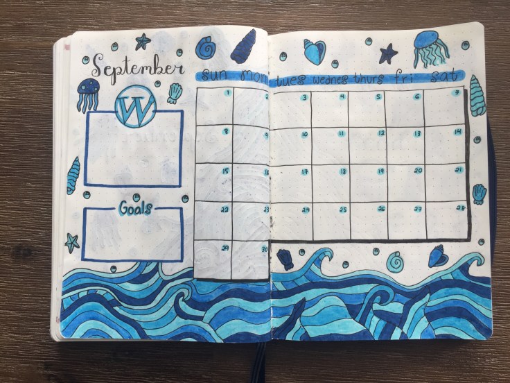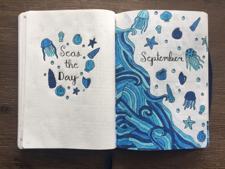 I mostly used the kind of neon-y owl on the bottom left, as you can see in my cover page:) It took me a little while to draw, and then I realized it was perfectly centred on the page and I should’ve drawn it slightly up more so that I could write September underneath and it wouldn’t look so cramped at the bottom. But I didn’t feel like re-drawing it so I just left it and it was fine. I did more of a bouncy cursive font this month, with some of the letters a bit smaller than others, which creates more interest. On the opposite page I have a nice, inspiring quote, surrounded by some geometric triangles in the corners. I love this title page because it’s simple and sophisticated and so pretty!!:))