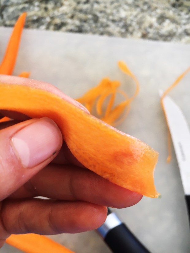 Carrots: Peel the carrots. Cut into sticks about five centimetres long and a centimetre wide. Roast for about 25-30 minutes, until soft and slightly caremelized.