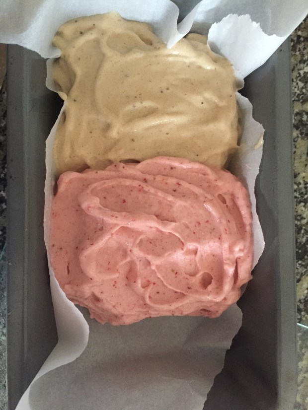 - Scoop out the Nice Cream from the blender and use it to fill up one third of a lined loaf pan. Put the loaf pan in the freezer while blending up the other flavours.