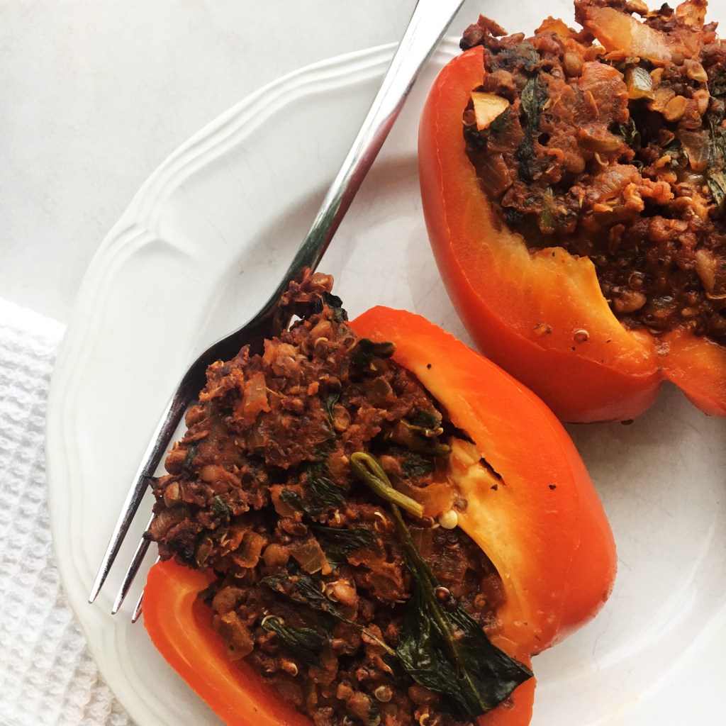 Preheat your oven to 400 degrees Fahrenheit. Cut out the tops of your peppers so that a round hole is left. Full each pepper with half of the lentil and quinoa filling, then place in a glass baking dish.